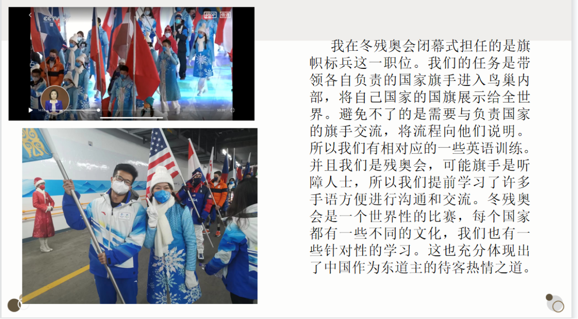 四位学生代表就冬残奥会闭幕式仪式环节四个岗位进行心得体会分享。
